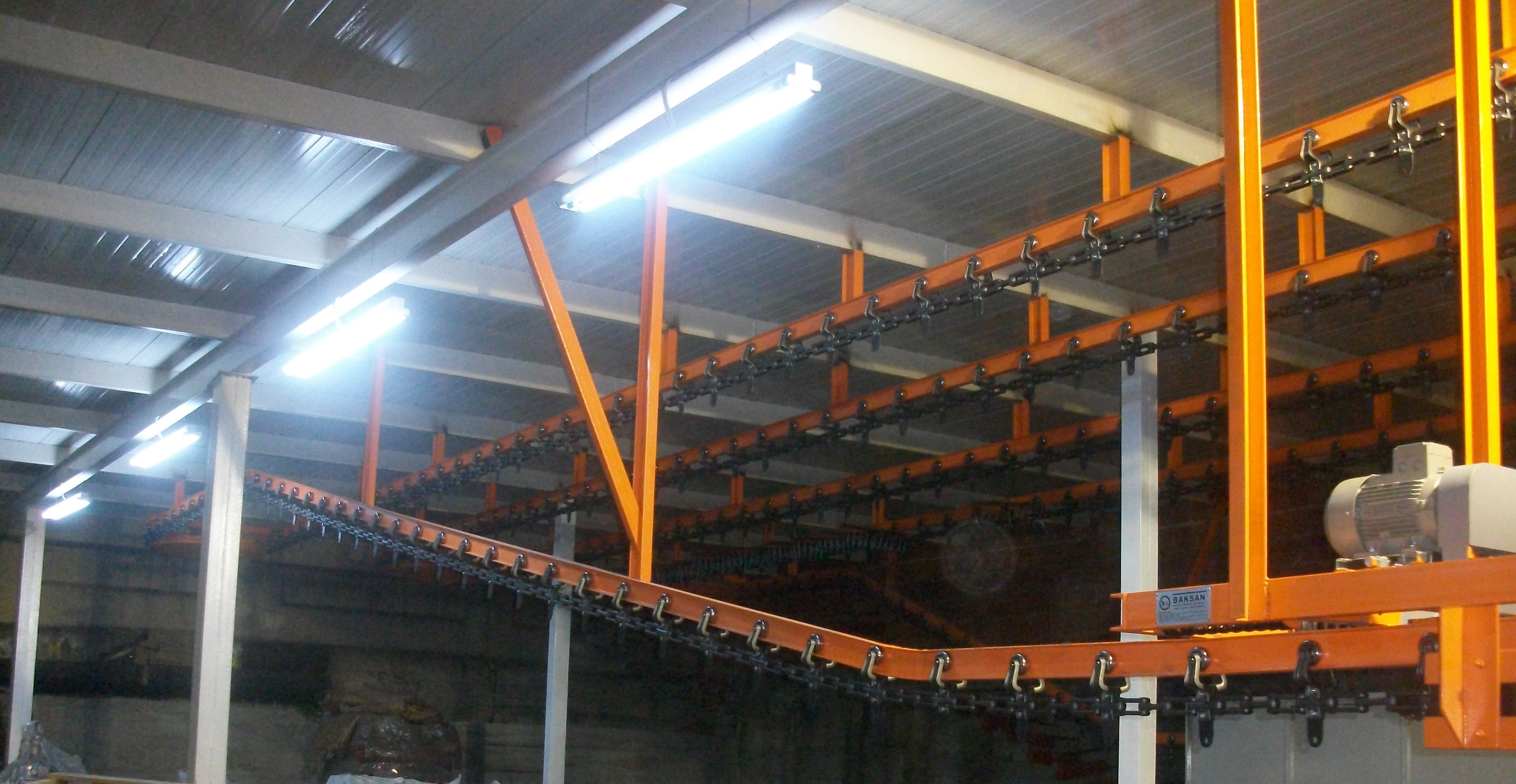Zincirler yapılarından dolayı, x ve y eksenlerindeki yatay hareketlerinin yanı sıra z ekseni üzerindeki düşey hareketlere de müsaittir. Yatay dönüşler kasnaklı ve ruloiu tiplerde farklı ölçü ve açılarda, dikey dönüşler de trolley mesafelerine de bağlı olarak değişen çap ve açılarda üretilmektedir. Bu sistemlerde zincirler, yan bakla, orta bakla ve pim adı verilen ve yüksek karbonlu çelikten sıcak dövme yöntemiyle imal edilmiş 3 parçadan oluşur.